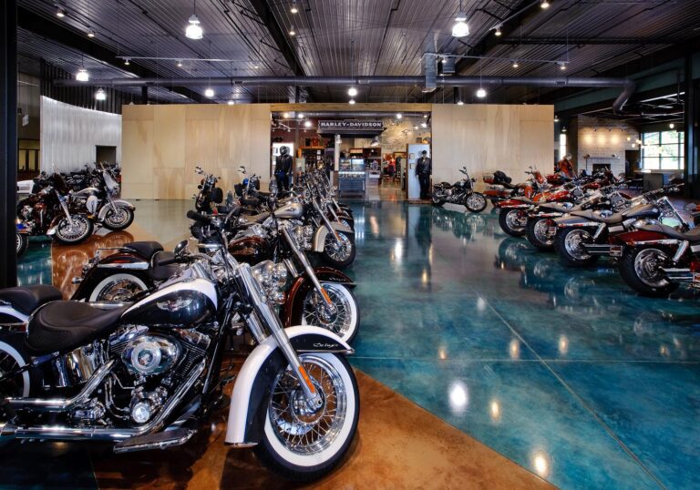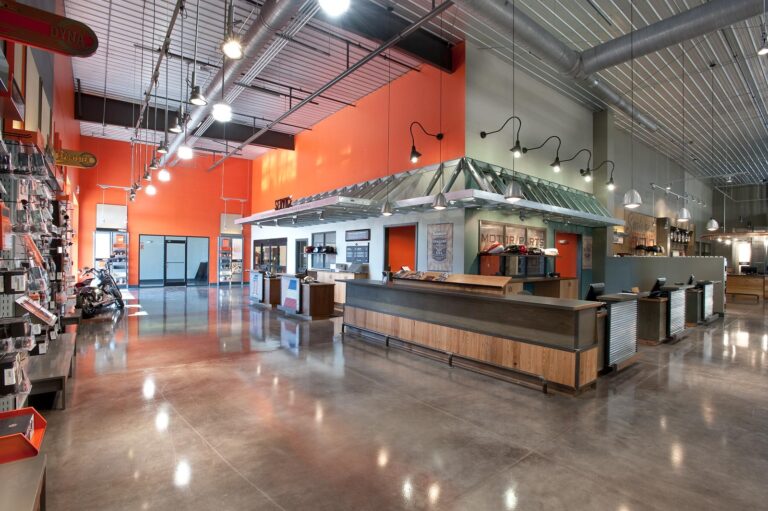 This Harley Davidson is a new 40,000 sq. ft. prototype. The building is pre-engineered with metal wall panels inside & out with stained concrete floors. Custom painting on walls of the Storefront and on the Interior walls. The entry has beautiful rustic wood floors with ceramic tile. There is a Parts & Services Department, Showroom with a Design Center, Accessories & Apparel Section. There is also a rider’s lounge with stone front fireplace and a fire pit outside.