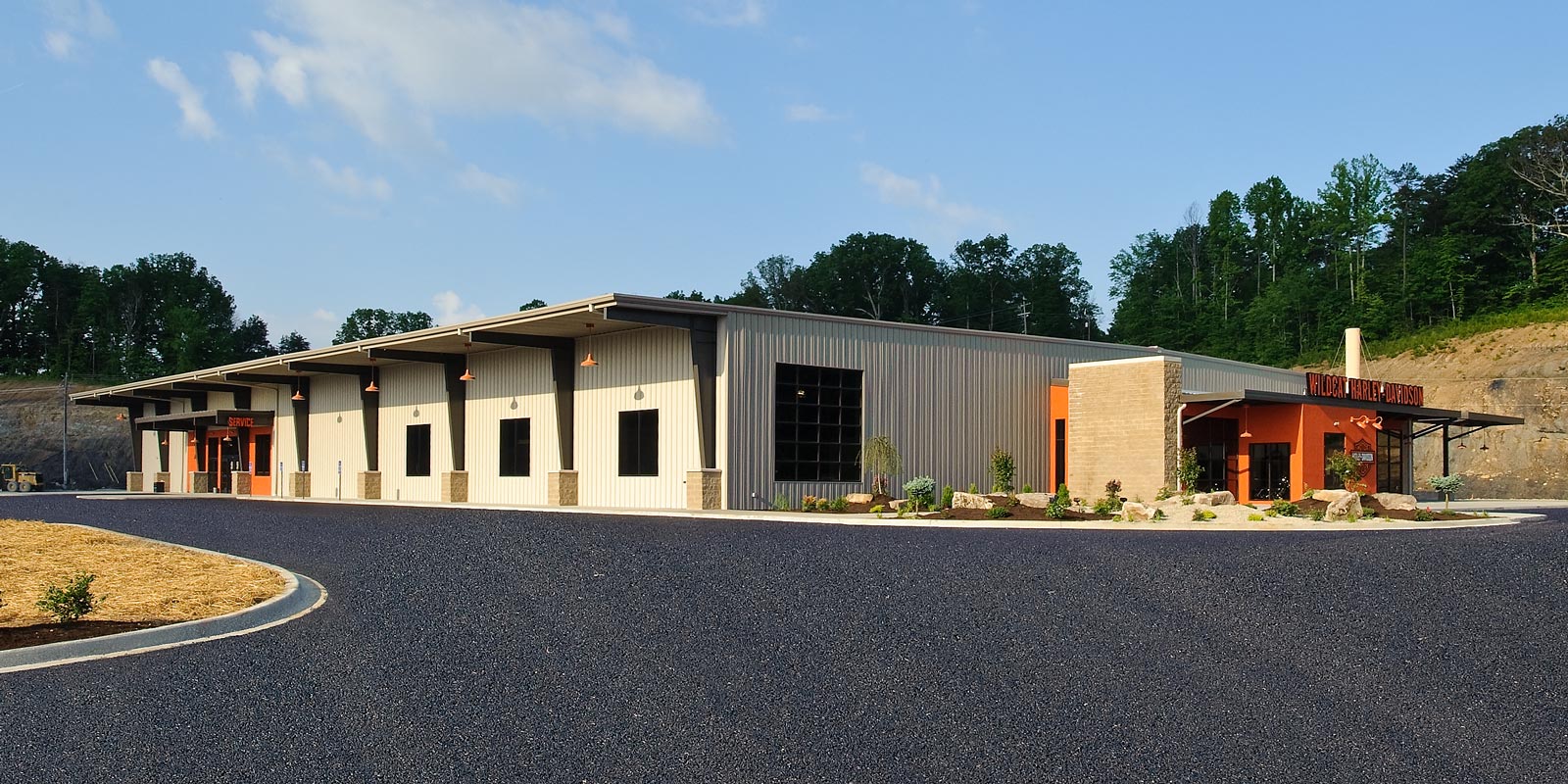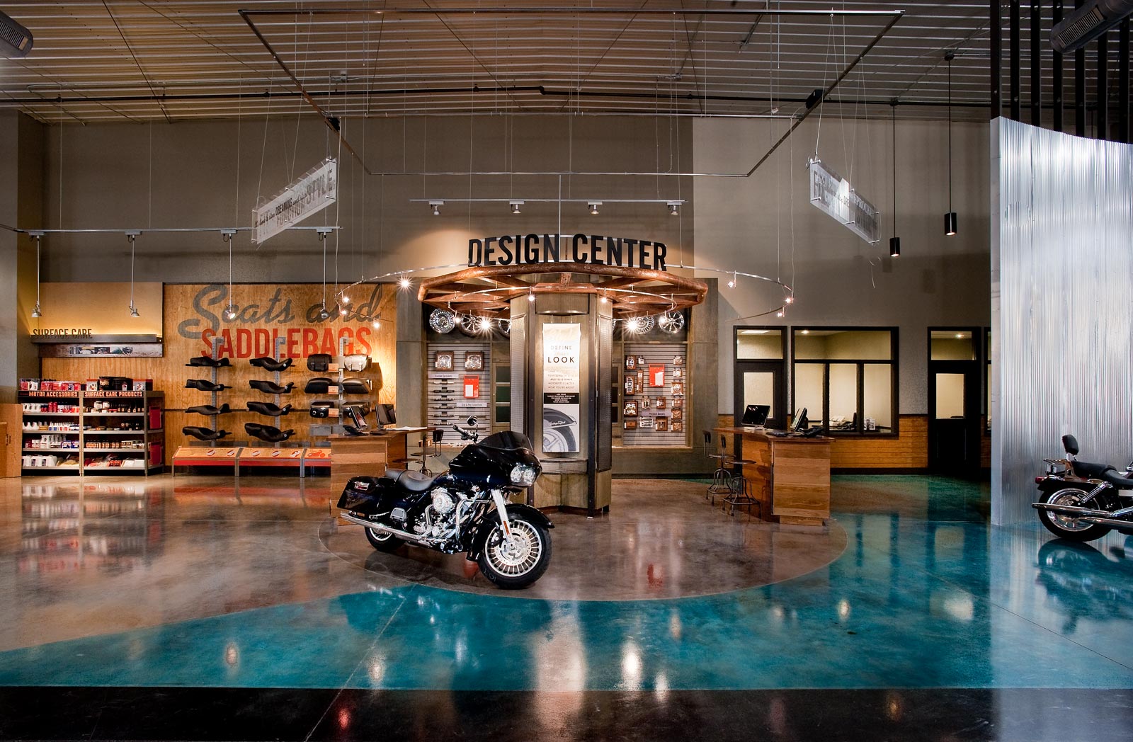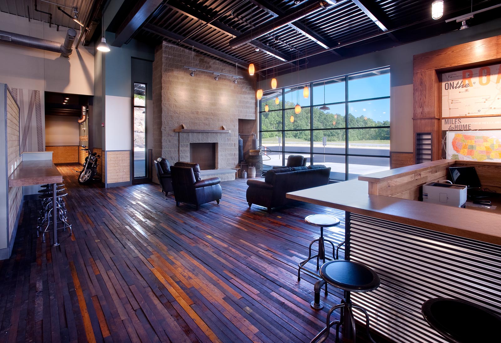 This Harley Davidson is a new 40,000 sq. ft. prototype. The building is pre-engineered with metal wall panels inside & out with stained concrete floors. Custom painting on walls of the Storefront and on the Interior walls. The entry has beautiful rustic wood floors with ceramic tile. There is a Parts & Services Department, Showroom with a Design Center, Accessories & Apparel Section. There is also a rider’s lounge with stone front fireplace and a fire pit outside.