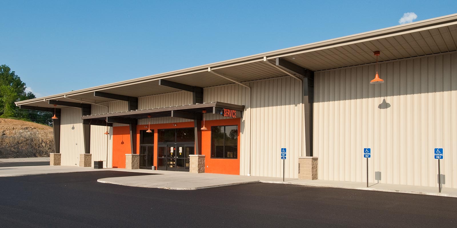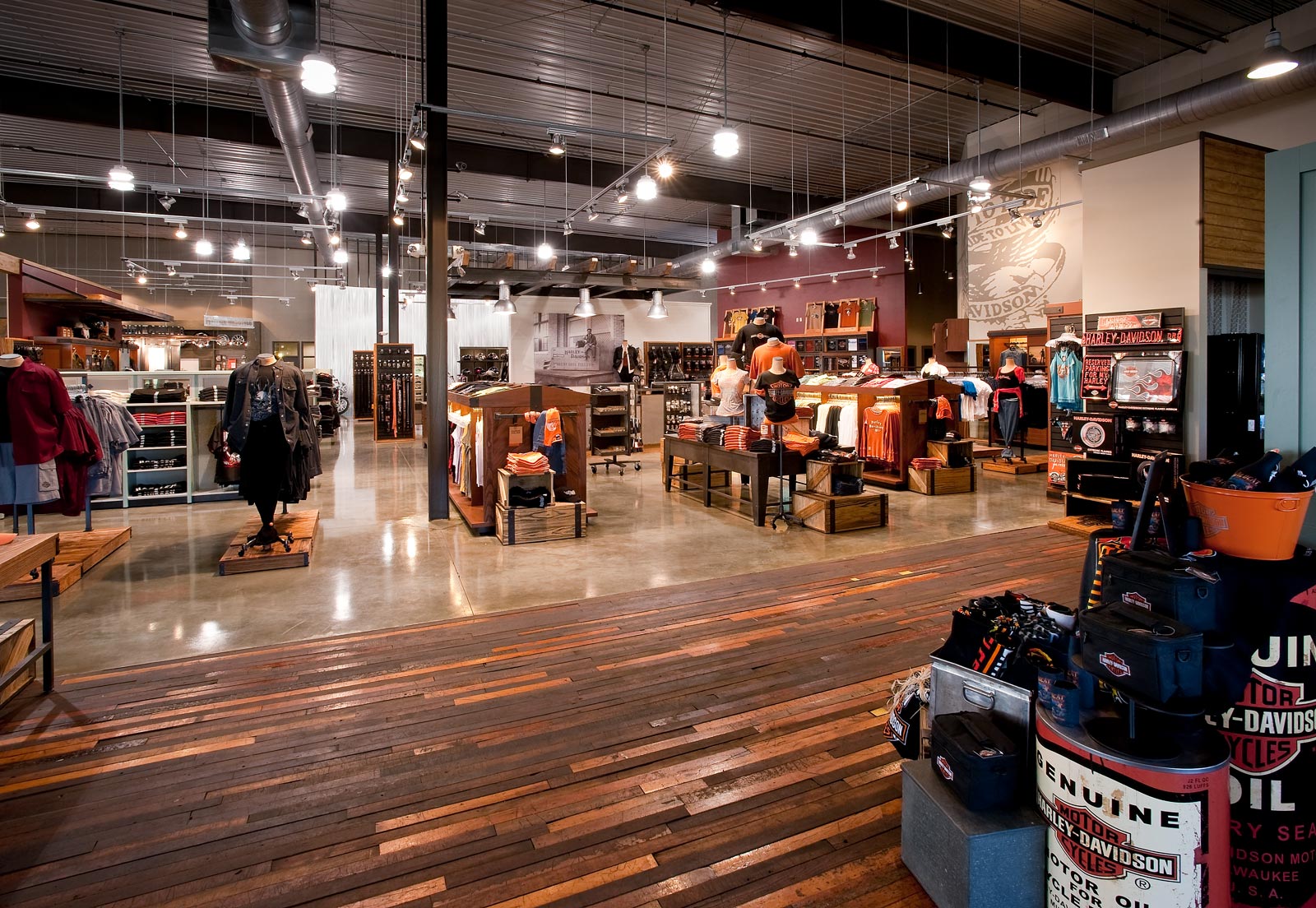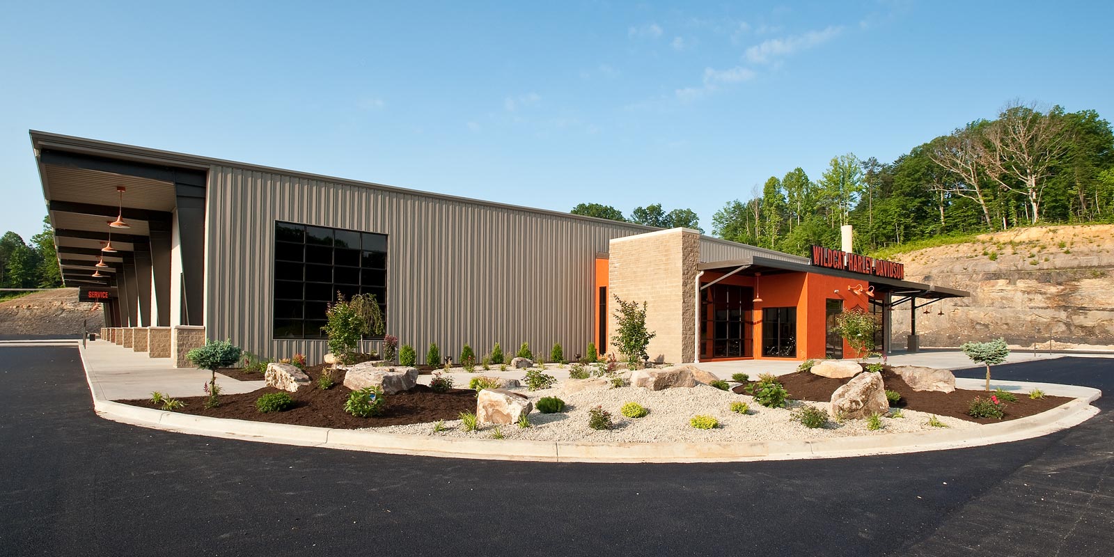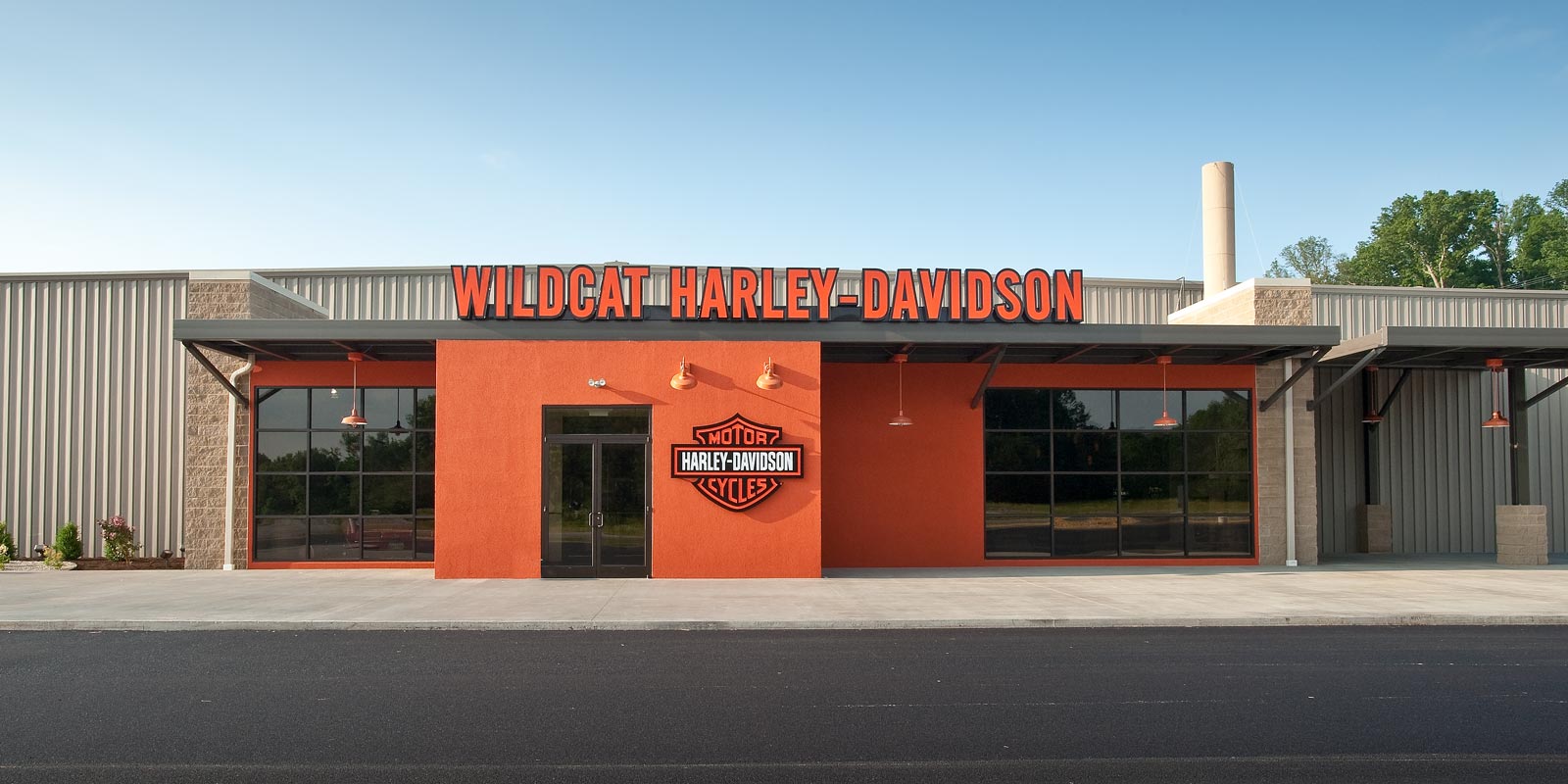 This Harley Davidson is a new 40,000 sq. ft. prototype. The building is pre-engineered with metal wall panels inside & out with stained concrete floors. Custom painting on walls of the Storefront and on the Interior walls. The entry has beautiful rustic wood floors with ceramic tile. There is a Parts & Services Department, Showroom with a Design Center, Accessories & Apparel Section. There is also a rider’s lounge with stone front fireplace and a fire pit outside.